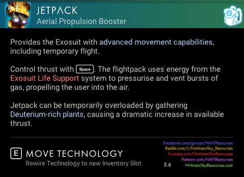 Rocket Boots is a technology that allows a player to fire their jetpack rapidly in effort to fly a greater distance and increase flight time. It needs to be installed in an exosuit inventory slot for it to take effect
