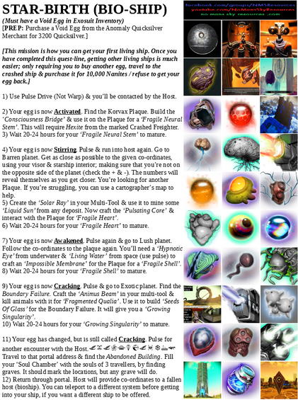 After the Space Encounter with a strange starship, the Void Egg becomes active and produces a number of coordinates which the player must follow to learn new technologies and repeat a long-forgotten Korvax experiment. The quest will eventually reward you a free living ship & will unlock the ability to gain more via another egg & 10,000 nanites (you don't do the mission again).