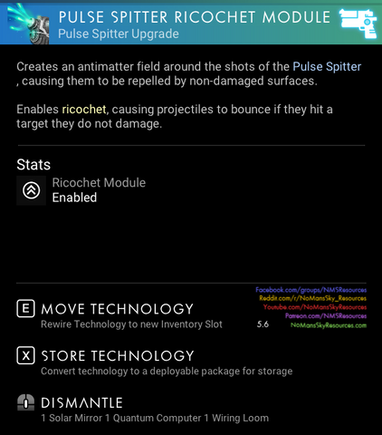 Pulse Spitter Ricochet Module is a technology that augments the Pulse Spitter, a Multi-tool weapon.